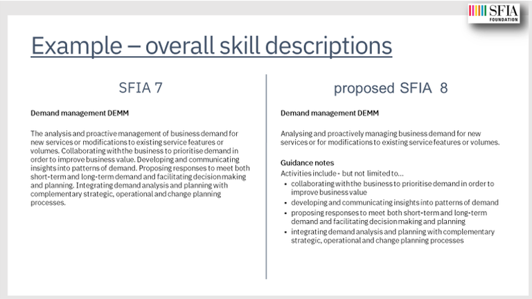 • in most cases we can re-use the existing SFIA 7 descriptions so that users familiar with SFIA 7 will have no surprises