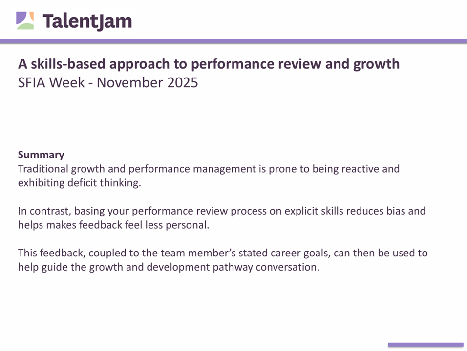 Traditional growth and performance management is prone to being reactive and exhibiting deficit thinking. In contrast, basing your performance review process on explicit skills reduces bias and helps makes feedback feel less personal. This feedback, coupled to the team member’s stated career goals, can then be used to help guide the growth and development pathway conversation.