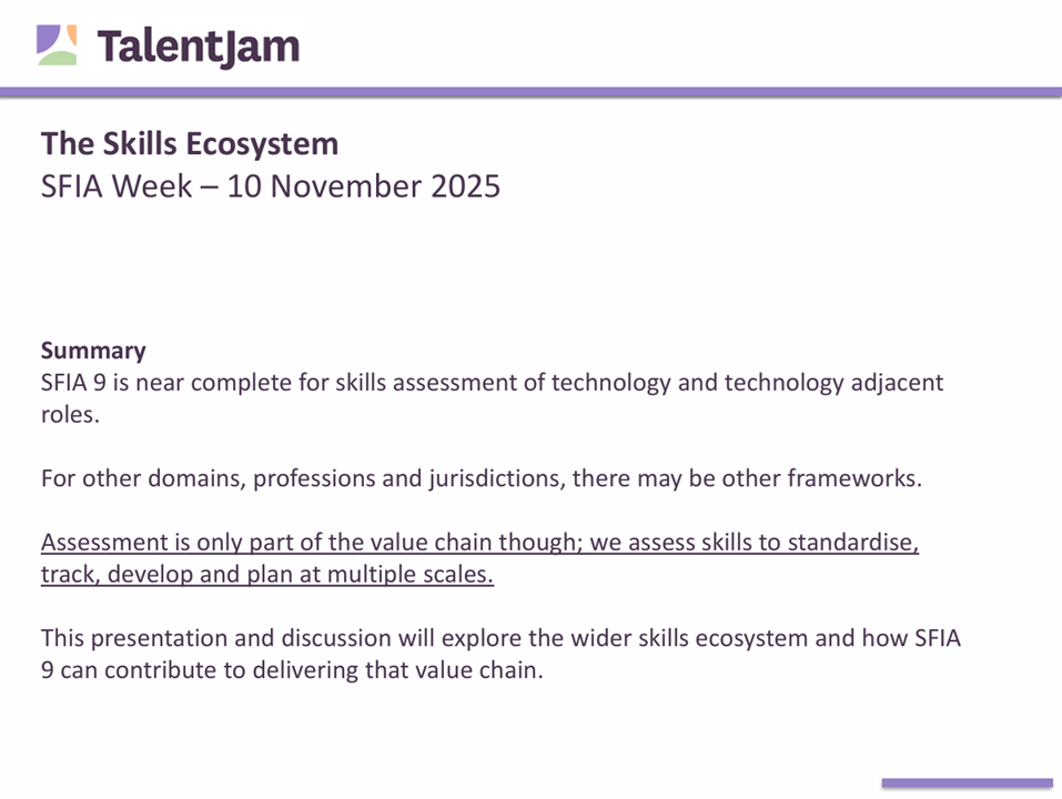 SFIA 9 is near complete for skills assessment of technology and technology adjacent roles. For other domains, professions and jurisdictions, there may be other frameworks. Assessment is only part of the value chain though; we assess skills to standardise, track, develop and plan at multiple scales. This presentation and discussion will explore the wider skills ecosystem and how SFIA 9 can contribute to that value chain