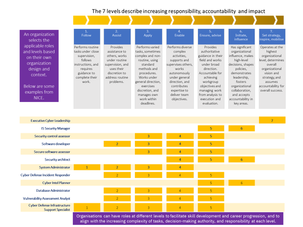 SFIA provides a structured and consistent approach to defining cybersecurity skills. Each skill is clearly described, supplemented by guidance notes, and detailed level-by-level practice descriptions that align with the framework's 7 levels of responsibility. Skills at a glance.