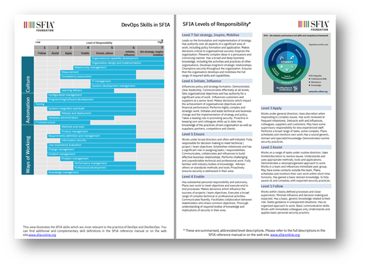 The skills at a glance page provides a one-page summary of the SFIA devops-related skills and competency levels.