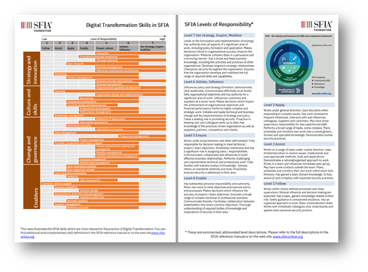 The skills at a glance section displays a one-page summary of the SFIA digital transformation skills and competency levels.